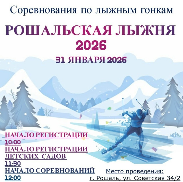 Соревнования по лыжным гонкам РОШАЛЬСКАЯ ЛЫЖНЯ 2026 31 ЯНВАРЯ 2026 НАЧАЛО РЕГИСТРАЦИИ 10:00 НАЧАЛО РЕГИСТРАЦИИ ДЕТСКИХ САДОВ 11:30 НАЧАЛО СОРЕВНОВАНИЙ 12:00 Место проведения: г. Рошаль, ул. Советская 34/2