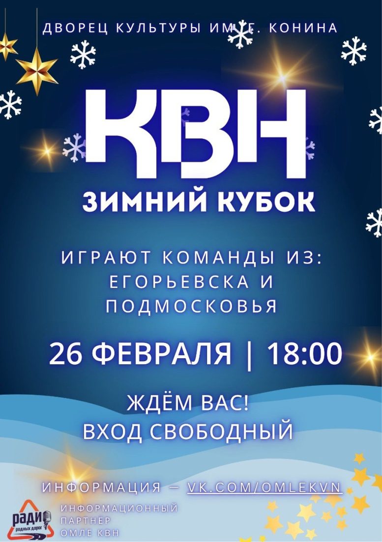 Дворец культуры им. Г. Конина Советская ул., 174, Егорьевск, Российская Федерация❄ЗИМНИЙ КУБОК ОМЛЕ КВН🏆 Четвертьфинал позади, а мы продолжаем КВН Кубок соберёт не только местные команды, но и соседей из Подмосковья Играем! Ждём всех! 📅26/02 ⌛18:00 📍МУК ДК им. Г. ...