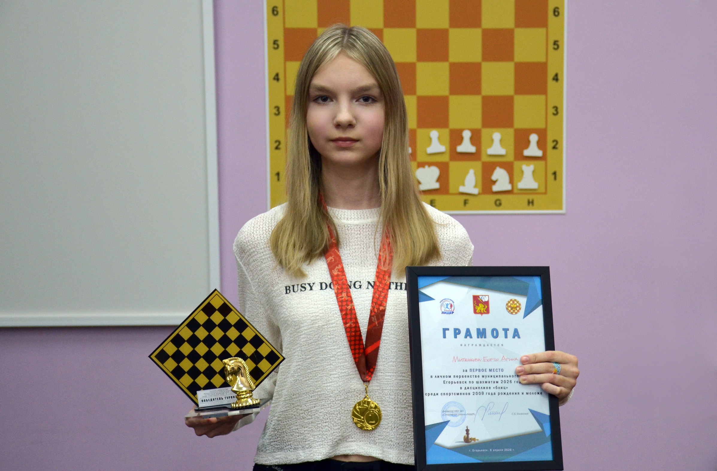 В турнире приняли участие 23 юных спортсмена. Одиннадцатилетняя Арина Митенкова-Борто по итогам первенства завоевала титул чемпиона города среди школьников в спортивной дисциплине «блиц».